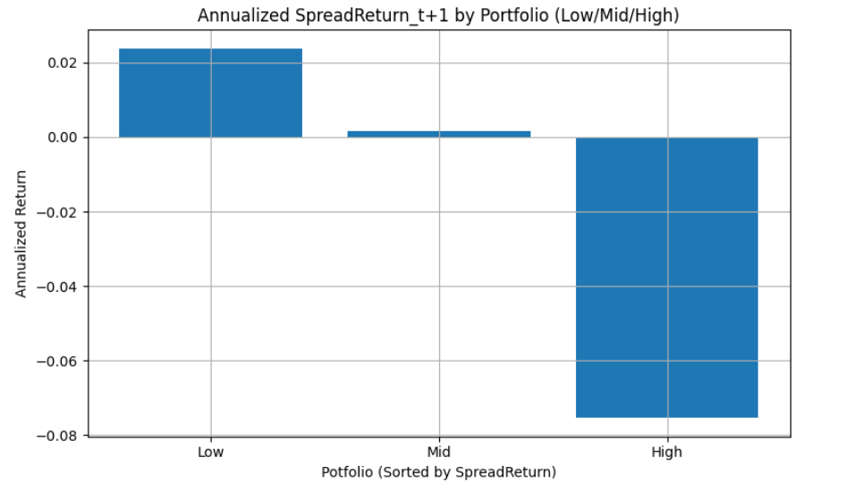 From the three-bin test, a simple Low minus High spread strategy returned nearly +10% annualized, with a t-stat of 3.91 — a statistically and economically strong signal. The five portfolio test showed the same structure.