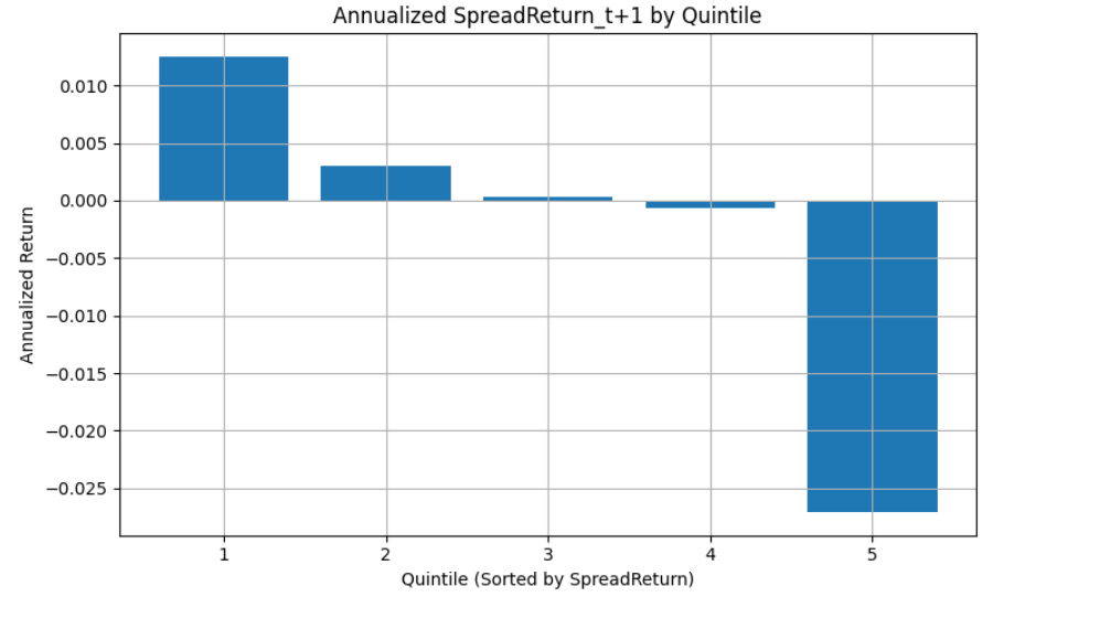 Grouped them into five equal-sized portfolios, from the most negative to the most positive spread return.